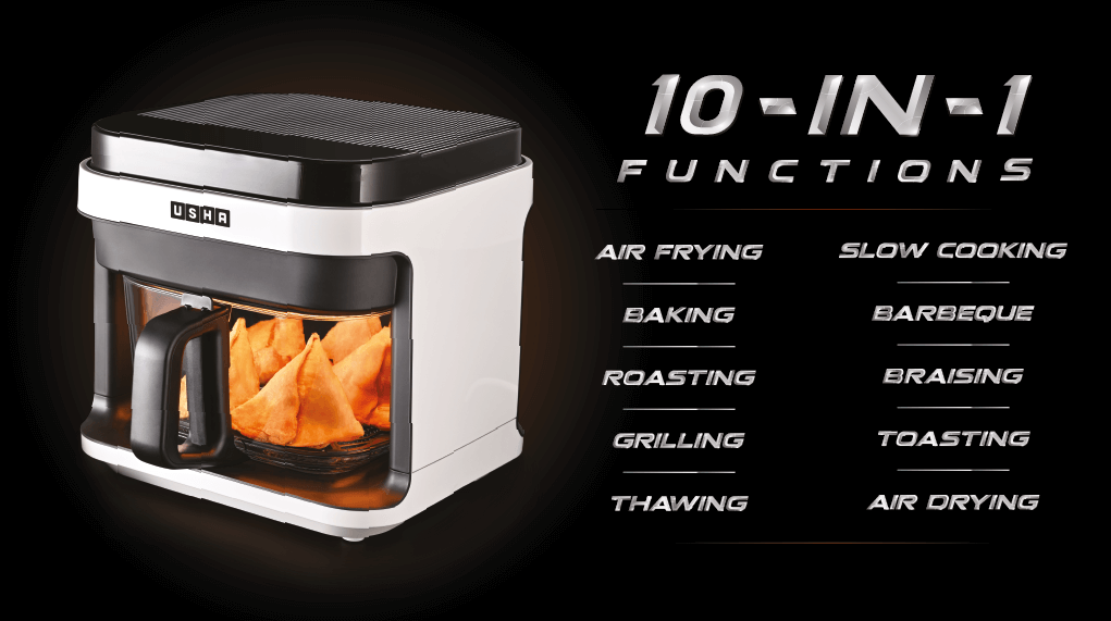 The Usha iCHEF Smart Air Fryer 5.5 L is your ultimate kitchen companion for guilt-free, flavorful, and versatile cooking. It's designed to take the guesswork out of meal preparation while ensuring you enjoy mouthwatering dishes with minimal to no oil. Choose from 8 preset menus for easy and convenient cooking. This air fryer isn't just for frying! It offers 10 functions, including air frying, baking, roasting, grilling, thawing, slow cooking, barbecuing, braising, toasting, and air drying.